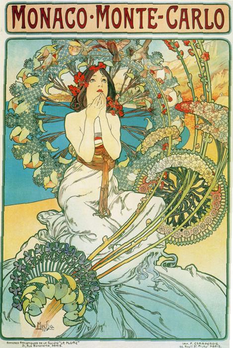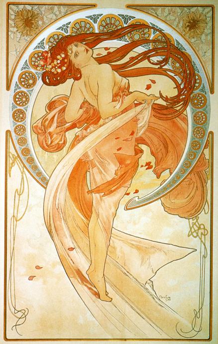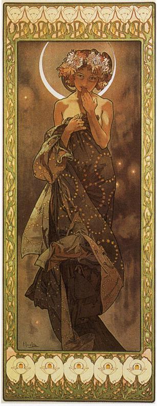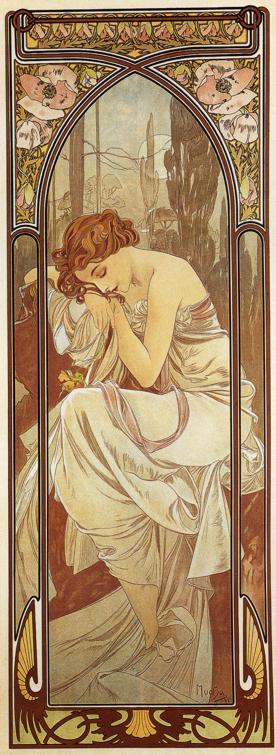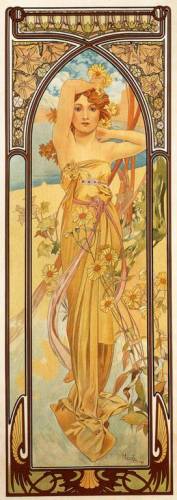 | Его стиль (в живописи, архитектуре, малых декоративных формах) так и назвали (и называют поныне) — «стилем Мухи». Или —«модерн», «югендстиль», «сецесьон». Название пришло из Франции. Да и самого художника в Европе порой считают французом. Но это не так. Альфонс Муха - выдающийся чешский художник, мастер театральной и рекламной афиши. Один из ярчайших представителей стиля модерн. Выдвинулся своими афишами для спектаклей театра «Ренессанс», парижского театра С.Бернар (Жисмонда, 1894; Дама с камелиями, 1896; Лорензаччо А.де Мюссе, 1896; Медея по мотивам Еврипида, 1898). Частично Альфонс Муха выступал и как дизайнер этих постановок: по его эскизам создавались не только платья, но и сценические ювелирные украшения. Альфонс Муха стал одним из ведущих художников французской рекламы; его композиции печатались в журналах либо в виде плакатов — с неизменной фигурой или головой томной дамы, погруженной в орнаментально-пестрый мир роскоши и неги. В том же «стиле Мухи» создавались и красочные графические серии (Времена года, 1896; Цветы, 1897; Месяцы, 1899; Звезды, 1902; все работы – акварель, тушь, перо), которые до сих пор тиражируются в виде арт-постеров. Собрал свои дизайнерские проекты (панно, витражей, ковров, мебели) в альбоме Декоративные документы (1901). Работал как книжный иллюстратор, исполнил декоративную живопись павильона Боснии и Герцеговины на Всемирной выставке в Париже (1900; не сохранилась) и Дома собраний в Праге (1910), нарисовал эскизы первых чехословацких почтовых марок и банкнот (1918). В 1913–1930 написал большой цикл Славянская эпопея (музей замка Моравски Крумлов); традиционно-академическая манера соединилась в этих полотнах, посвященных начальным главам истории чехов, поляков, русских и других народов Восточной Европы, с плоскостной ритмикой модерна. Из серии "Сезоны". 1896: Серия "Искусство". 1898: Цикл "Цветы". 1898: Из серии "Время суток". 1899: Из серии "Драгоценные камни". 1900: Из серии "Луна и звёзды". 1902: | |